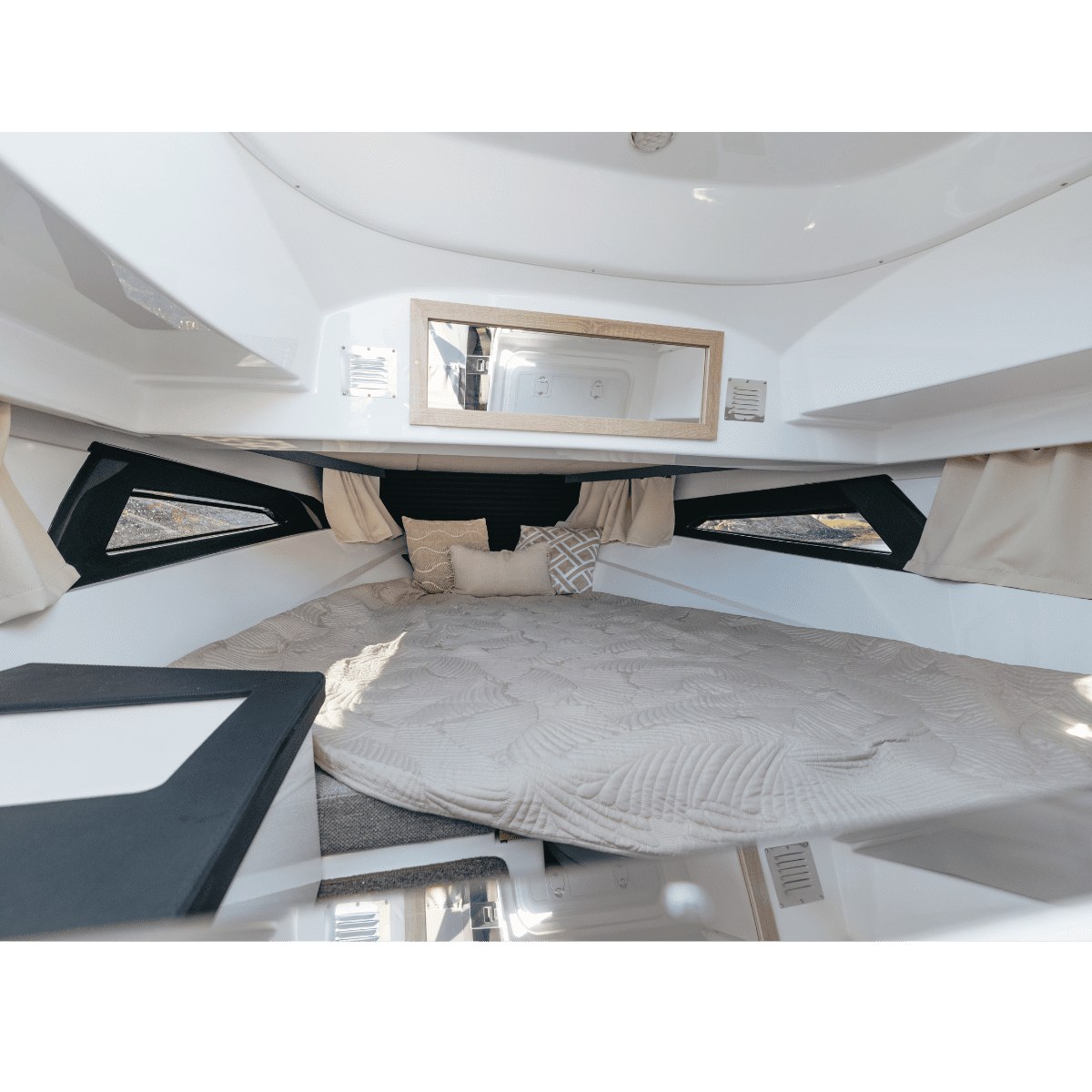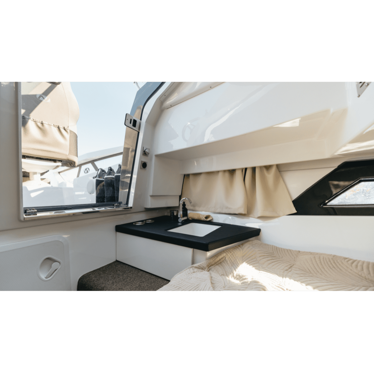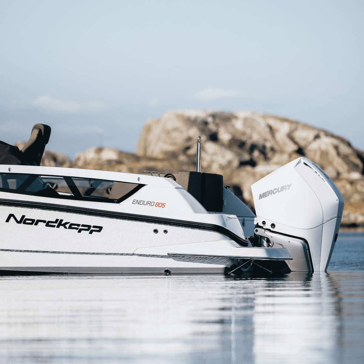 Efter ett besök i cockpiten på Enduro 805 märker du snabbt att förarplatsen är placerad högt och tydligt vilket ger bra sikt på sjön. Det skapar även ett lägre akterdäck där familj och vänner får en varmare plats att vara på i högre farter. I kombination med ett högt fribord får du en säker och bra plats att vara på till havs. Enduro 805 är även utrustad med en stor och bekväm hytt som gör båten lätt och bekväm att övernatta i. Det är även en mysig och härlig plats för barnen att värma sig i när man kör in för kvällen från en fantastisk sommardag till sjöss. Fönstren ner mot vattenlinjen, tillsammans med den tonade kabindörren, ger dig gott med ljus in i hytten.