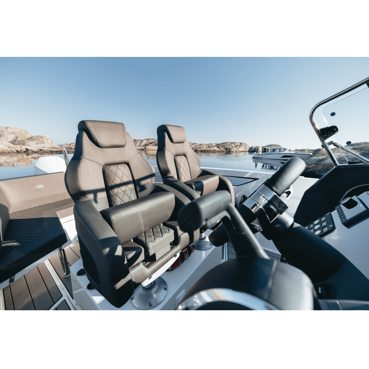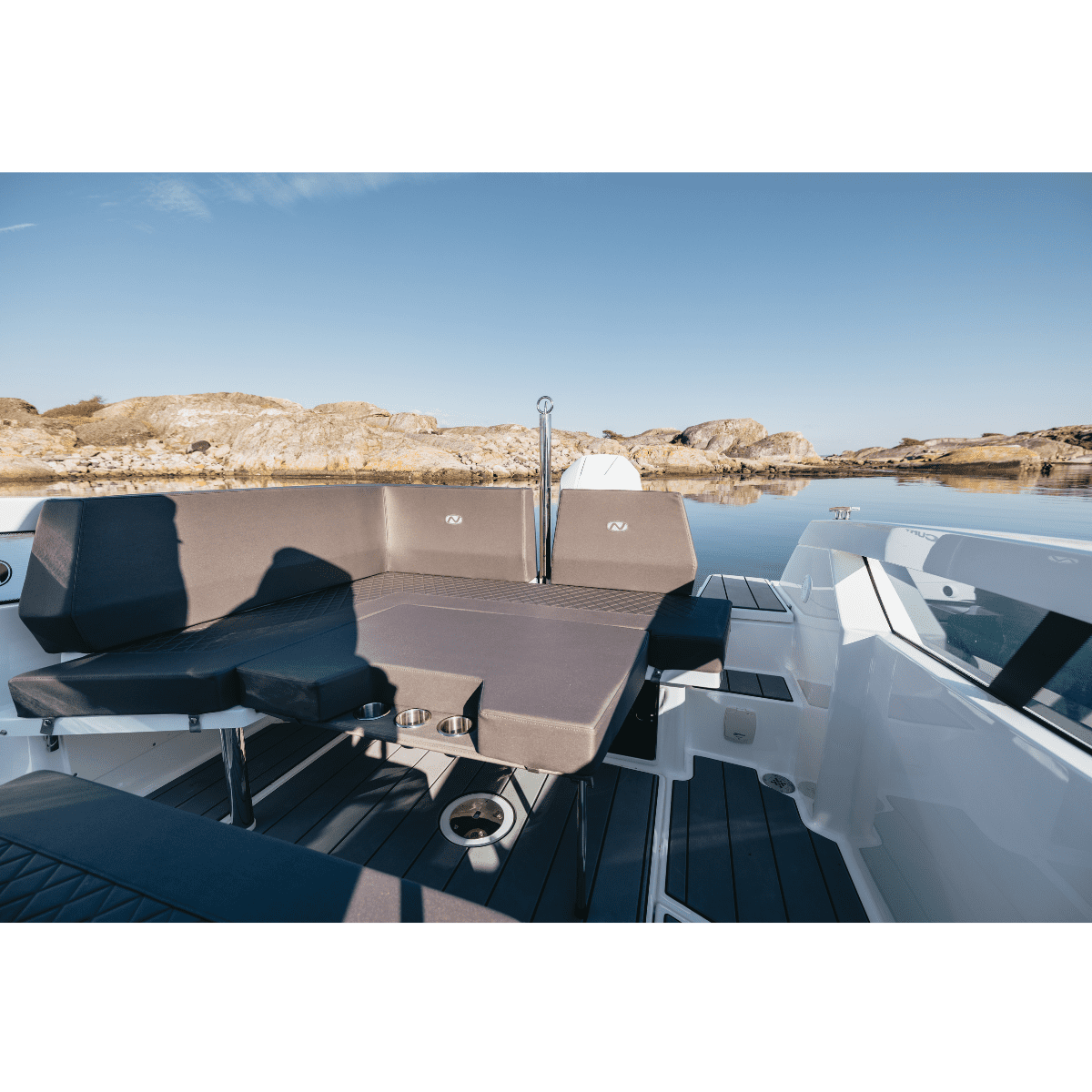 Med toalett (tillval), handfat och dusch på akterdäck har du här en skärgårdsjeep som du enkelt kan ta med på en weekendtur. Akterdäcket har en stor L-soffa och ett bord med plats för 4-6 personer. Det går att välja till ett pentry precis bakom förarplatsen om du så önskar.
