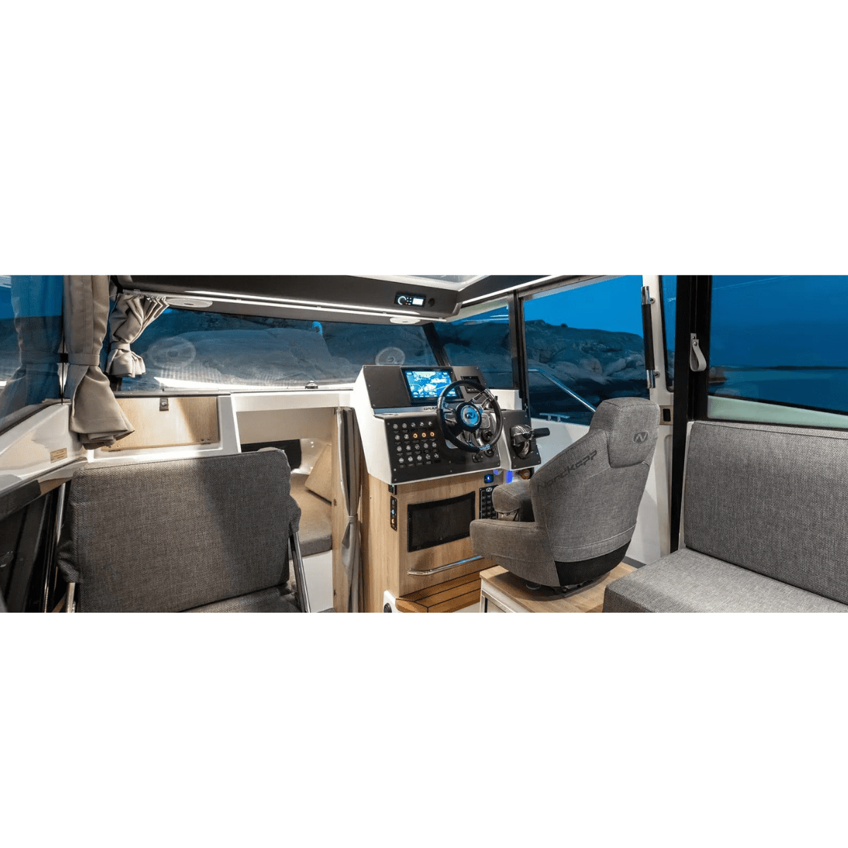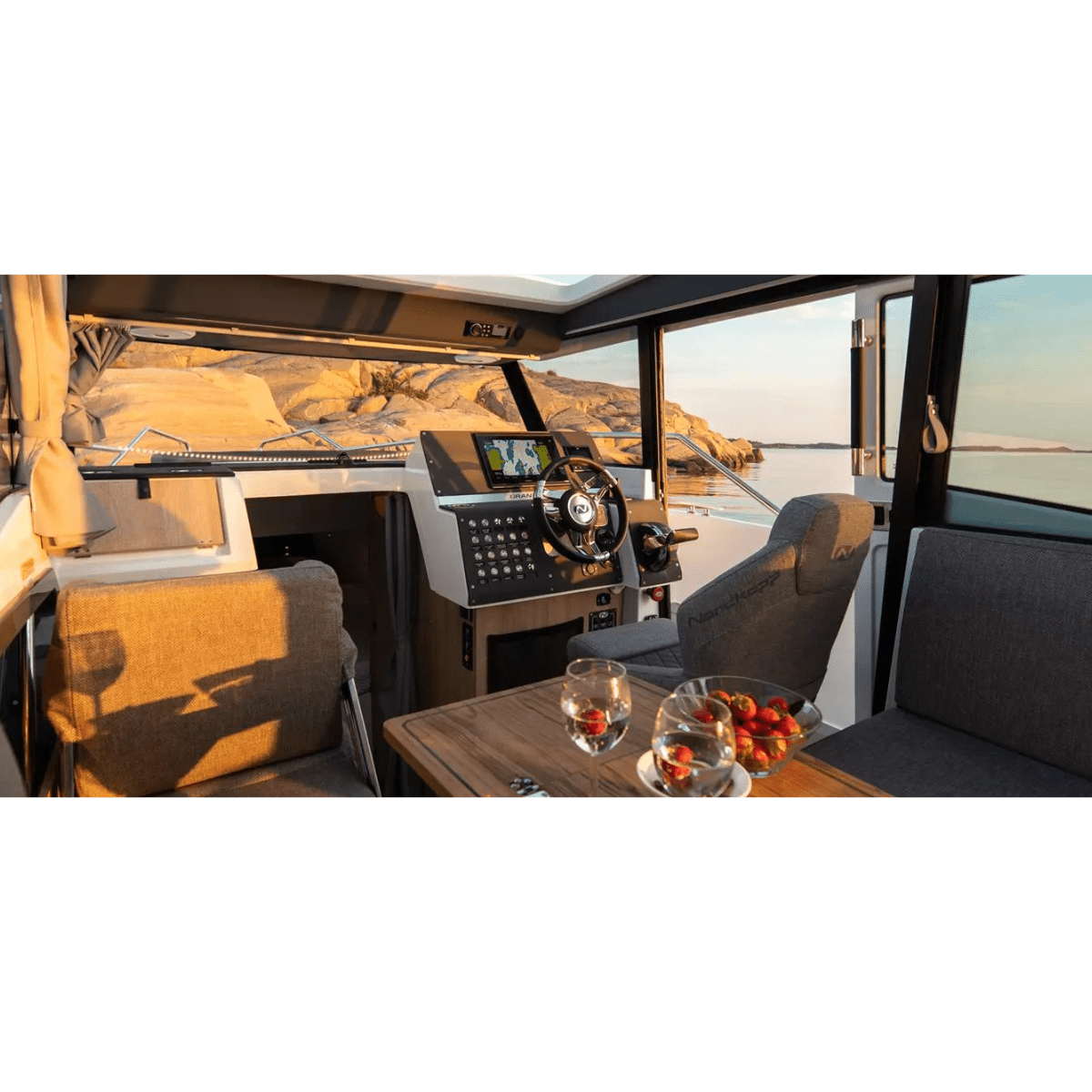 Nordkapp Gran Coupe 905 är utvecklad för den nordiska sommaren. Ljusa ytor med stora fönster och ett vackert panoramatak som släpper in sommarsolen och naturen hela vägen in till dig. Gran Coupe 905 låter dig njuta av naturen också på våta sommardagar. Ett helhetskoncept där sittgruppen på akterdäck kan avskärmas från väder och vind. Det ger en varm och god upplevelse också på kalla sommardagar. Gran Coupe 905 är Nordkapps största båt någonsin. Den har ett utseende och linjer som skiljer sig ut på vattnet.