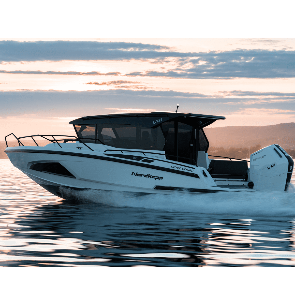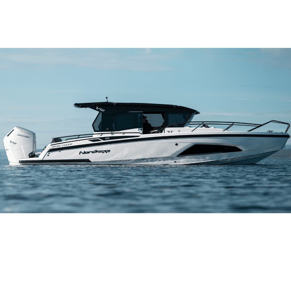 Gran Coupe 905 V12 följer Nordkapps stilfulla och skandinaviska design. Med aerodynamik i fokus ger båten dig uppmärksamhet från omvärlden. Samtidigt tar båten hand om alla funktioner och praktiska detaljer som du uppskattar när du är ute till sjöss. Med svarta detaljer, tonade rutor, anpassad V12-interiör och Mercury Verado V12 i aktern, sticker GC905 V12 ut från mängden.