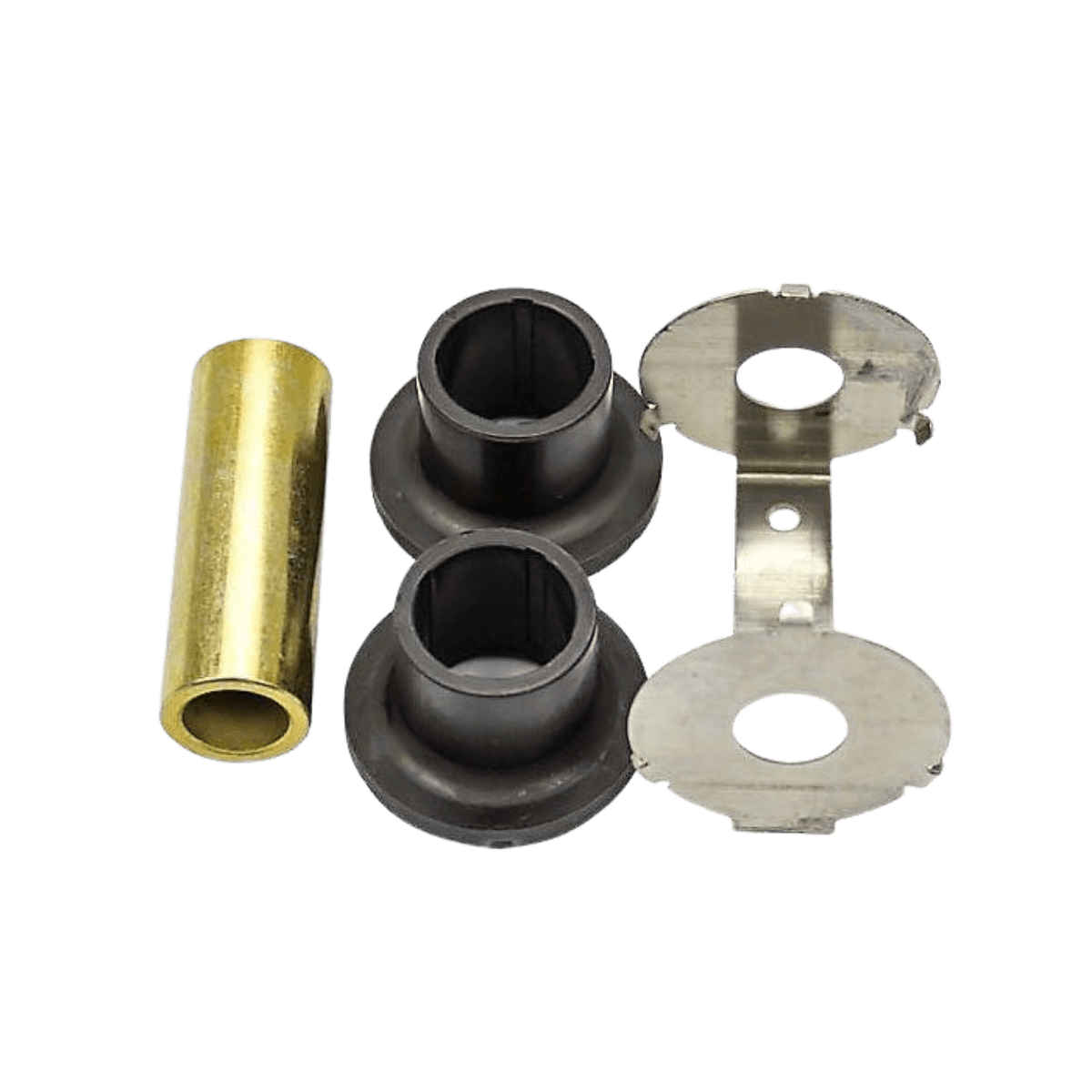 Den här satsen innehåller två bussningar, en hylsa och en slitplatta enligt bild. Allt du behöver för att förnya upphängningens a-armar.